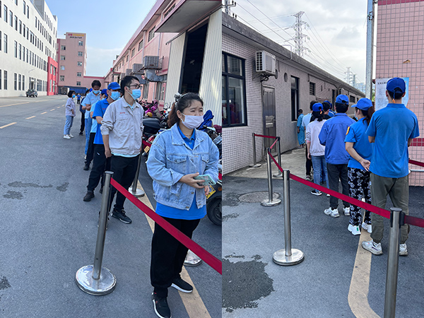 當(dāng)天,金環(huán)電器員工們戴好口罩,自覺、有序地排隊,等候核酸檢測。行政人員提醒員工提前準(zhǔn)備好粵康碼、粵核酸碼,默契配合,以便減少時間做好核酸檢測工作。金環(huán)電器領(lǐng)導(dǎo)表示,醫(yī)護(hù)人員上門采樣服務(wù),對企業(yè)幫助很大,不僅確保企業(yè)全員工落實好核酸檢測,還不耽誤企業(yè)生產(chǎn),兩全其美。